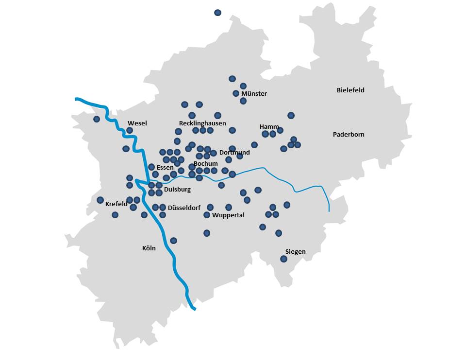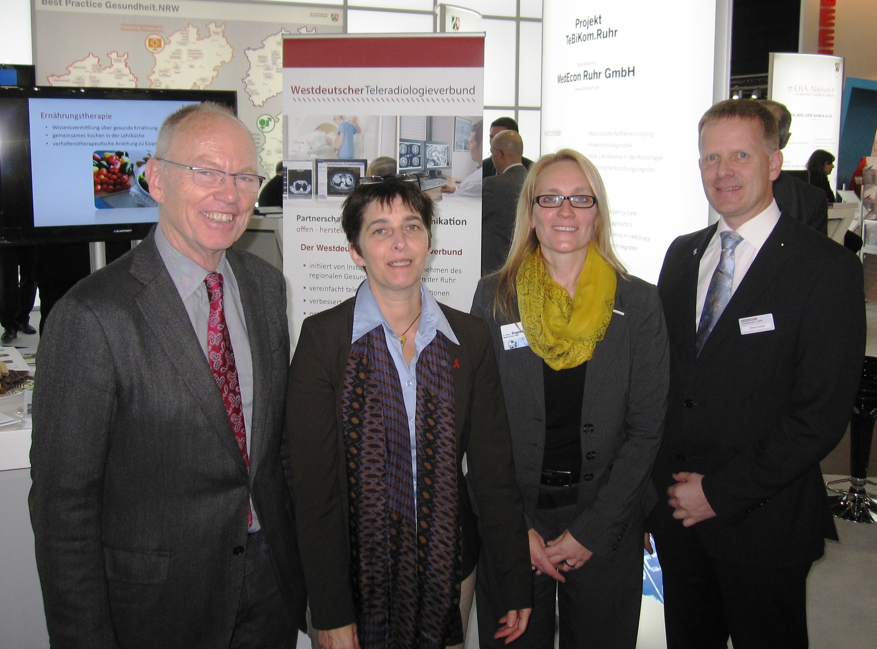 Besuch der Box von MedEcon Ruhr am Stand des Landes NRW auf der MEDICA 2013 durch die Ministerin für Gesundheit, Emanzipation, Pflege und Alter (MGEPA) Barbara Steffens (Bild: v.l. Prof. Dr. L. Heuser, Ministerin B. Steffens, Dr. Denise Bogdanski, Markus Kremers). Sie informierte sich dort über die Weiterentwicklung des Teleradiologieverbandes Ruhr (TRV), der mit seinen knapp 90 Mitgliedern längst über die Landesgrenzen Nordrheinwestfalens (rechtes Bild) hinausgewachsen ist und daher in Westdeutscher Teleradiologieverband (WTRV) "umgetauft" wurde. |